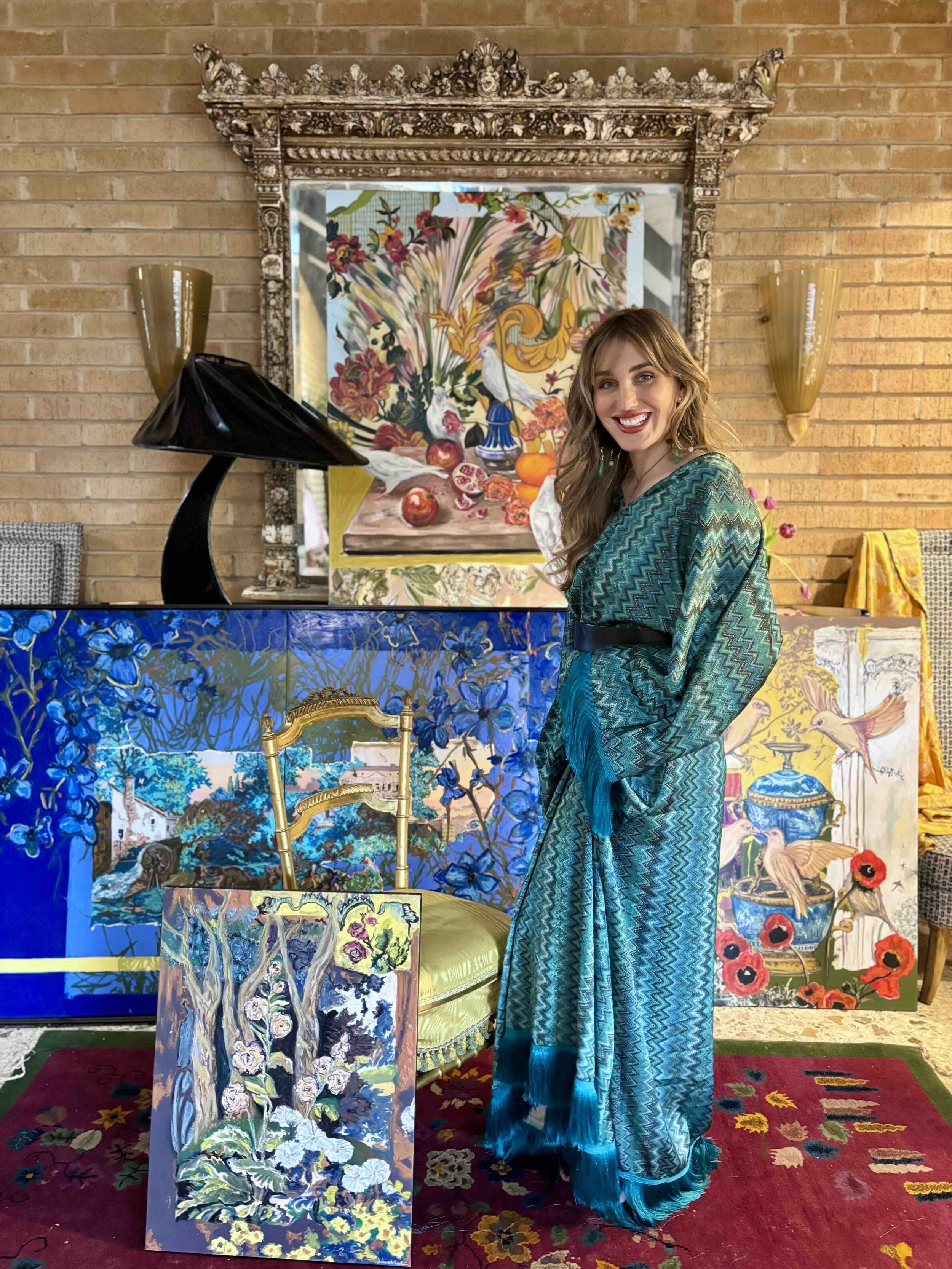 I later specialized in interior design, establishing my own firm where I explore the intersection of space and aesthetic. Often, the designs I envision evolve through a collage-like practice that encompasses vibrant patterns and color stories, weaving together textiles, wallpaper, shadows, and nature. Alongside my exploration of space and aesthetic, painting has become a crucial aspect of my artistic expression.